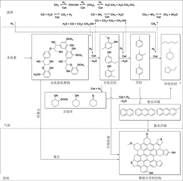 基于木質素油的產物產率和組成,提出了一種用于加氫處理的反應過程。木質素使用活性炭催化劑和氫氣(圖3)。它涉及在液相和氣相中發生的許多連續和平行反應。對低分子量烷基酚類和芳族化合物的所需反應涉及通過裂解鍵來對木質素進行熱和催化解聚(加氫裂化)。最具反應性的連接是醚鍵,盡管這些在木質素中不是很豐富。活性炭催化劑促進解聚反應,但在不存在活性炭催化劑的情況下的反應也產生(有限)量的木質素油,表明熱解聚反應也起作用。低聚物片段可以進一步解聚成烷基酚類形式的低分子量化合物或再聚合(也與已形成的低分子量化合物一起)成更高濃度的結構,最終導致燒焦。后一種途徑可能是熱反應,因此可以通過使用非常活潑的活性炭催化劑來抑制,所述催化劑通過催化隨后的轉化來減少活性中間體的量。中間低分子量烷基酚類在反應條件下不是惰性的,并且可以進一步加氫脫氧成芳族化合物和烷烴。