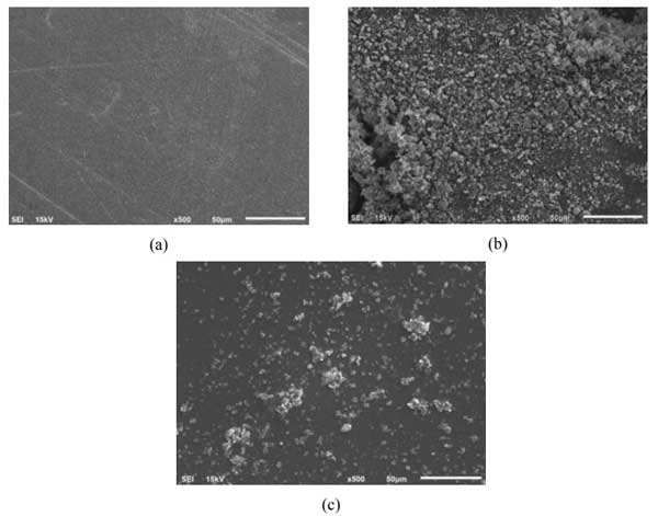 圖1:(a)殼聚糖膜,(b)活性炭和(c)殼聚糖復(fù)合膜的SEM分析。