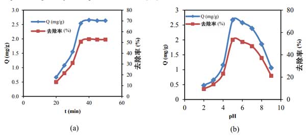 圖2:接觸時(shí)間(a)和pH(b)對(duì)活性炭殼聚糖復(fù)合膜對(duì)Cd2 +的吸附容量(Q)的影響。