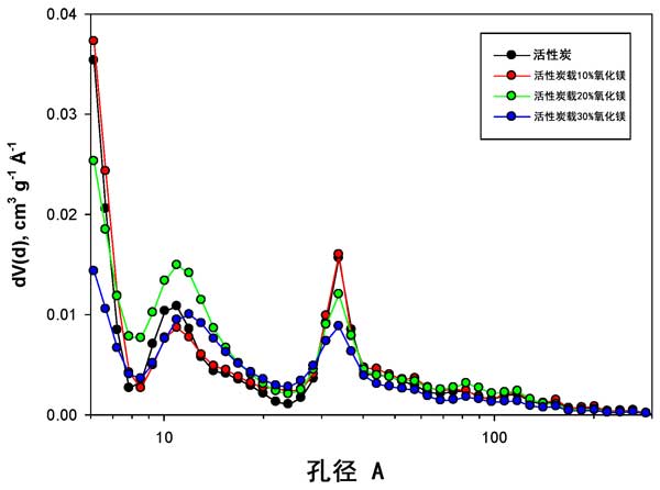 圖1:活性炭以及10、20和30wt%氧化鎂負載的活性炭的孔徑分布(PSD)。