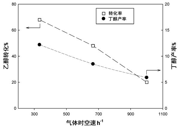 通過改變反應器中的活性炭負載量,同時保持總流速和入口乙醇濃度不變,在400°C下初步研究了氣體時空速度對20%活性炭負載氧化鎂樣品的影響。結果以乙醇轉化率和丁醇產率報告于圖3。正如預期的那樣,乙醇轉化率通過降低氣體時空速度而增加。值得注意的是,對于較低的氣體時空速度值,制得丁醇的產率也增加。應該注意的是,在我們的實驗中負載的最大催化劑量(1克)對應于約3厘米的催化床高度。更長的催化劑床層將超過電爐的等溫區,因此,未探索出較低的氣體時空速度值。另一方面,即使使用較大可能劑量的催化劑,在350°C下進行測試所得到的丁醇產量也可忽略不計。