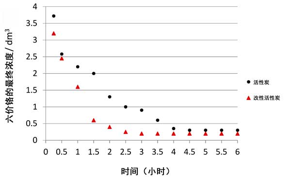 從獲得的測試結果可以得出結論,吸附時間對特定碳的鉻(VI)去除效率具有顯著影響。鉻酸根離子相對于活性炭的最大還原發生在4.5小時后。在硝酸改性活性炭上去除鉻的速率更高,并且在2.5 h后發生了吸附平衡時間。然后進行穩定化處理,并進行進一步測試(確定等溫線),發現該接觸時間為不同的活性炭通常不超過6小時。