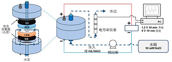 方案1中描述了用于檢查脫鹽性能的膜電容去離子系統(tǒng)。每個電極由作為集電器的石墨,交流電極和IEM組成。將陰離子交換膜和陽離子交換膜分別放在陽極和陰極上。一對電極由厚度為110 µm的尼龍墊片隔開。使用蠕動泵將進(jìn)料水供應(yīng)到電解池。處理后的溶液直接流過電導(dǎo)率儀,隨后使用單程模式。除了IEM的存在外,還以與電容去離子中使用的相同配置進(jìn)行了CDI實驗。使用電池循環(huán)器在1點分別施加電壓10分鐘。在充電步驟中為2 V,在放電步驟中為0V。從第三個循環(huán)獲得數(shù)據(jù),并從至少三個操作中計算出平均值,以實現(xiàn)可重復(fù)性。