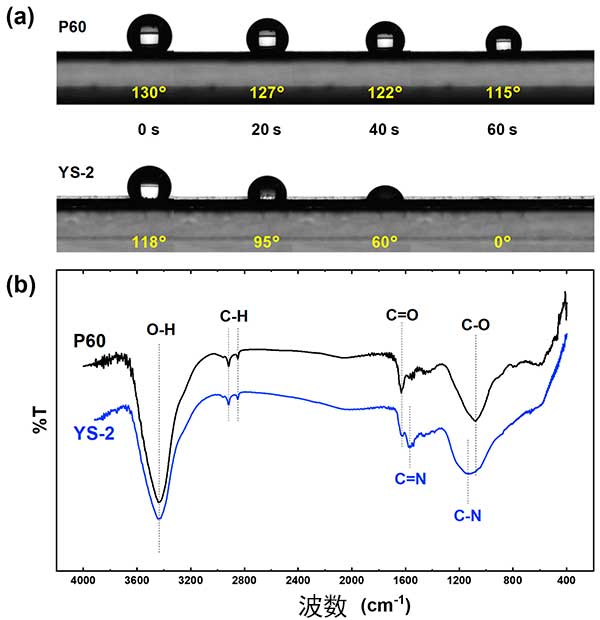 圖1:(a)用疏水和親水活性炭制造的兩個電極的接觸角隨時間變化,以及(b)兩種活性炭的FT-IR光譜。