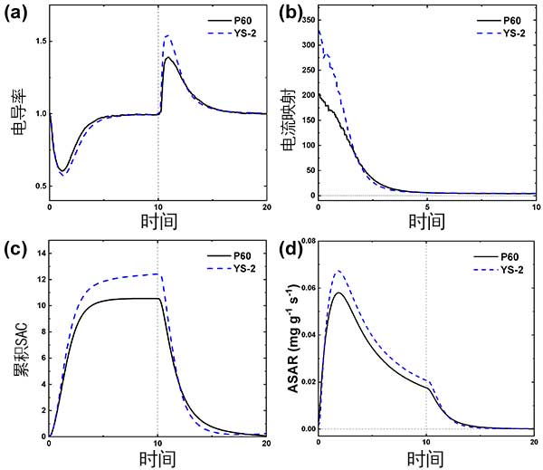 圖2以(a)歸一化電導(dǎo)率曲線表示使用疏水和親水活性炭電極的電容去離子性能。如圖2a所示,在充電步驟期間,與疏水活性炭電極相比,歸一化電導(dǎo)率在親水活性炭電極的情況下顯示出更低和更寬的下降。對于親水活性炭電極,在充電步驟開始時,圖2b中所示的特定電流也顯得較高。圖2的a,b在電容去離子表明更多離子在充電步驟中的初始幾分鐘吸附在親水活性炭電極的表面上。這意味著在親水活性炭電極上可以更快,更高地吸附鹽。可以推斷,由于水分子更容易進(jìn)入微孔,因此親水活性炭電極上離子的可及表面積大于疏水活性炭電極上的離子的可及表面積。