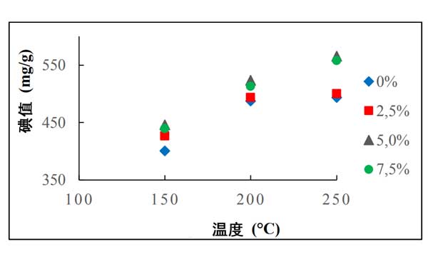 從圖1可以看出,熱解溫度具有增加活性炭和木炭的碘值的作用,因為它增加了熱解反應器中的壓力,從而促進了碳鏈的斷開。這也導致了轉移碳的數量增加。會在熱解過程中誘發碳氫化合物和其他有機化合物的分解。此外,它增加了木炭和活性炭孔的表面積。