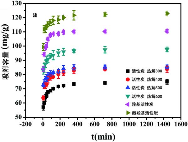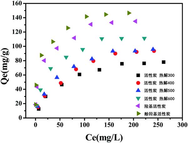 大量研究表明,有機污染物在水介質上的吸附包括分配和吸附作用。為了評估在活性炭上吸附化合物時在碳化相中的吸附和在非碳化相中的分配的貢獻,雙模式模型在該研究領域中被成功引用。通過雙模式模型計算了多菌靈在不同濃度的活性炭上的分配和吸附。在該實驗中,雙模型為所有樣品的等溫線提供了良好的擬合(圖3)。在本研究中,所有活性炭上多菌靈的吸附均大于分配所有多菌靈濃度的吸附。但是,隨著多菌靈濃度的增加,分配(Q p)和吸附(Q ad)對總吸附的貢獻也不同。在低濃度范圍內,吸附大于在活性炭上的分配,并且Q ad值貢獻超過總吸附的97%。但是,在高濃度范圍內,多菌靈對不同樣品在整體吸附中的分配和吸附的貢獻不同。當多菌靈的濃度達到300 mg L-1時在熱解300、400、500攝氏度的活性炭上,吸附對總吸附的貢獻仍然遠遠大于分配作用。盡管活性炭中含O官能團的含量逐漸減少,但分配對總吸附的貢獻率卻逐漸增加,特別是對于羧基活性炭和酚羥基活性炭,它們的Q p值分別達到39.4%和44.13%。主要原因可能是樣品表面上含O官能團的減少導致更好地暴露于樣品表面和多菌靈濃度增加,從而導致吸附過程飽和。因此,多菌靈可以分配給非碳化相。