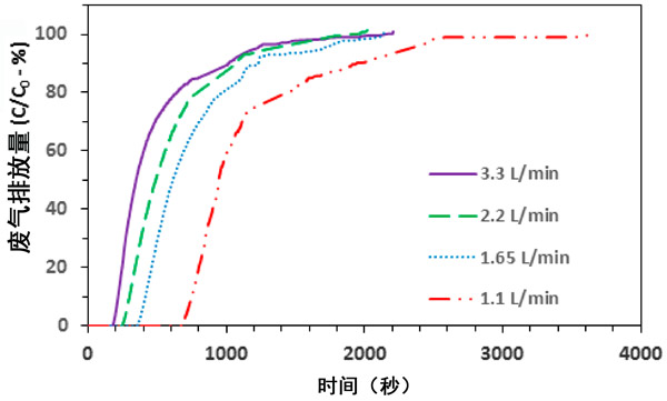圖3:進(jìn)水氨/氣體流量對(duì)活性炭吸附的影響。