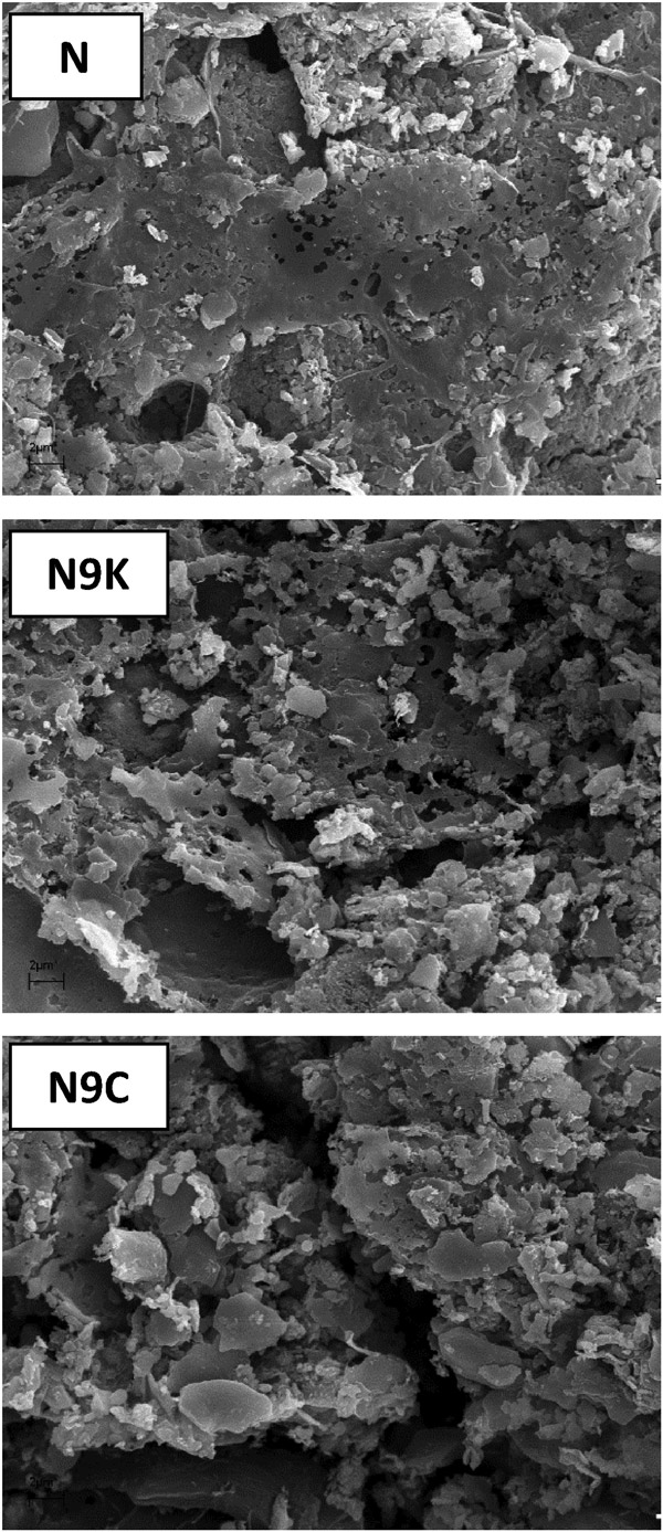 活性炭和經改性后獲得的樣品的化學成分。兩種修飾均導致灰分含量以及結構中特定元素的變化,其中這些變化對N9K樣品而言更大。起始活性炭(N)暴露于碳酸鉀會導致礦物質(灰分)的顯著下降,同時氫含量下降兩倍(可能是碳結構芳構化的結果)由于活性炭顆粒的表面氧化,增加了氧氣量。還值得注意的是,灰分含量比在CO 2中退火的N9C樣品低了近10倍。大氣層。N9K中的灰分很可能是由于活化后將其用5%的鹽酸溶液洗滌而導致的。圖1所示的SEM圖像也證實了各個活性炭的質地和形態多樣性。可以看出,根據制備程序,樣品在尺寸,形狀以及孔的數量或排列方面存在顯著差異。特別是在活性炭和N9C樣品中可以觀察到的較亮片段可能是其結構中存在灰分(礦物質)的結果。