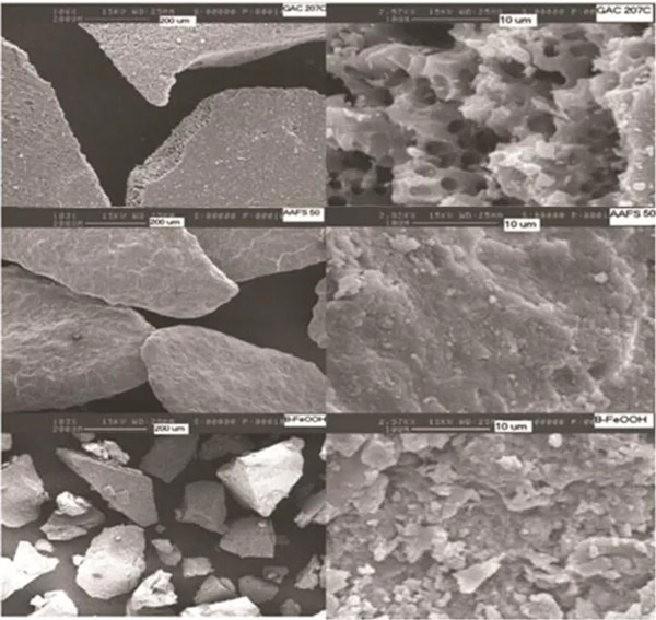 圖2顯示了吸附劑的SEM圖像。活性炭晶粒的撕裂邊緣也顯示出內部“孔”。其內部結構可以被認為是碳板的石墨型分層。活化過程中產生的孔隙和大量碎屑導致了這種吸附劑的易碎性。AAFS晶粒顯示出相同的傾斜形狀,表面看起來光滑且具有均勻的涂層。在更大的范圍內,僅可見很少的裂縫或孔洞,這表明表面積主要在外部。β-FeOOH的表面具有高脆性,因此表面光滑且帶有大量碎屑。多孔結構與SEM照片非常吻合(圖2),說明了活性炭的片狀結構及其眾多的空洞,而鐵化合物則顯得光滑,只有很少的裂紋。活化過程中產生的孔隙和大量碎屑導致了這種吸附劑的易碎性。考慮規模,中孔和大孔上看到照片(尺寸以上2.5 μ M)。β-FeOOH的表面易碎,因此表面光滑,帶有大量碎屑。該刻度不允許人們區分赤霞石微晶(FeOOH的β形式)的特征桿雪茄形狀。