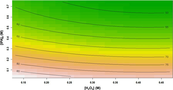 圖2顯示了總有機碳去除效率百分數與H 2 O 2濃度和初始異丙醇濃度的關系。從響應輪廓中可以看出,將異丙醇初始濃度從0.038 M增加到0.743 M,導致TOC去除率從85.17%急劇降低到46.29%。可能是因為在相同的應用反應條件下,自由基(OH•)的數量保持恒定,而初始異丙醇濃度卻增加了。換句話說,相對較少量的氧化基團可用于攻擊異丙醇分子。類似地,總有機碳降解性能也隨著H 2 O 2濃度的增加而逐漸降低。過量的H 2 O 2可能促進自動清除反應的發生。