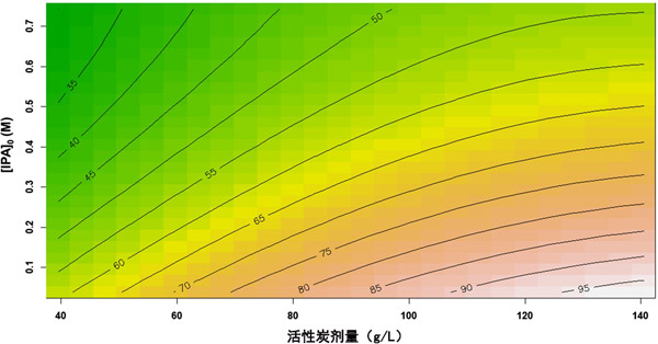 圖2:過氧化氫濃度和初始異丙醇濃度的相互作用效應及其對總有機碳去除率的影響;钚蕴康膭┝勘3趾愣ㄔ90 g/L。