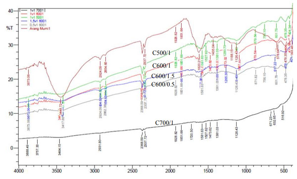 對(duì)于峰的強(qiáng)度,活化溫度在降低強(qiáng)度中起重要作用。較高的溫度將產(chǎn)生具有較少官能團(tuán)的活性炭。最高活化溫度樣品顯示幾乎平坦的光譜。同時(shí),對(duì)于活化劑定量,效果很小。比率從0.5增加到1.5似乎對(duì)樣品的化學(xué)性質(zhì)沒有任何影響,因?yàn)槿齻(gè)光譜相似。