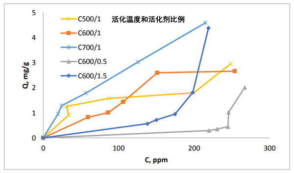 從圖2中可以看出,活性炭在不同的活化溫度(500℃,600℃和700℃)和活化劑比率(0.5、1.0和1.5)下的鋰吸附等溫線。似乎在較低濃度下吸附能力相對(duì)較低。這表明鋰離子對(duì)活性炭表面的親和力低。高濃度下容量的增加與孔隙率成正相關(guān)。活性炭的較大表面積傾向于更多地吸附鋰離子。在等溫線的分類中,該等溫線被認(rèn)為是III型等溫線,對(duì)于無孔或大孔吸附劑來說是典型的。因此,鋰離子似乎不附著在微孔內(nèi)部,而是附著在外部和大孔表面。活性炭對(duì)鋰離子的親和力低。炭表面的碳原子與溶液中的鋰離子之間的低相互作用可能是由于離子的原子質(zhì)量低所致。原子間勢(shì)相互作用表明該力與相互作用原子的原子質(zhì)量以及原子之間的距離具有正相關(guān)。