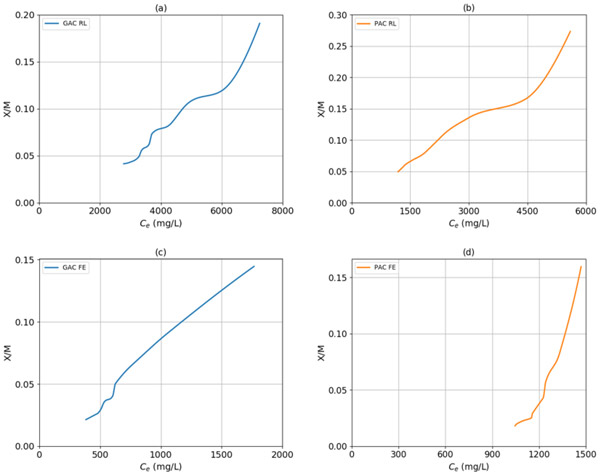 圖1顯示了顆粒活性炭與原浸出液,粉狀活性炭與原浸出液,粉狀活性炭與廢液以及粉狀活性炭與廢液的實驗等溫線。兩個樣品的曲線和兩個活性炭對應于S形的等溫線(II型)的行為,因為曲線是凹向上,所以多層吸附進行活性炭的表面上。利用該信息,就滲濾液而言,不管活性炭顆粒的性質和大小如何,都可以假定吸附劑中殘留的化學需氧量是通過物理吸附發生的。