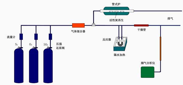 實(shí)驗(yàn)裝置如圖1所示。使用單因素實(shí)驗(yàn)研究活性炭劑量,氧氣含量和煙道氣流速對活性炭吸附的影響。將一定量的吸附劑放在15×150 mm的U形管中,并在混合氣流下(在恒定混合氣體中含有2000 ppm 二氧化硫,一定量的氧氣)在60°C的水中加熱。,并用氮?dú)馄胶舛趸虻牧坑帽銛y式煙氣分析儀分析廢氣中的廢氣。計(jì)算吸附劑活性炭的脫硫效率,從而確定了合適的吸附條件。