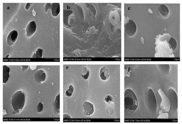 圖2:在0(a),2(b),4(c),6(d),8(e),10(f)循環(huán)數(shù)后經(jīng)過再生處理的活性炭的SEM圖像。