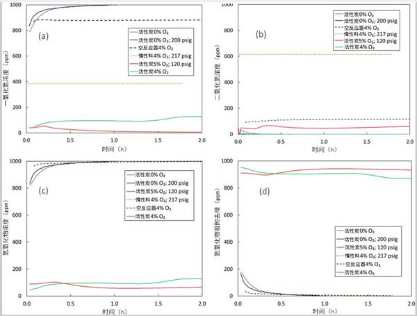 在大氣或高壓下沒(méi)有氧氣的情況下進(jìn)行的基線活性炭測(cè)試中吸附的NO,NO 2,氮氧化物和氮氧化物的濃度曲線證實(shí),即使在200 psig的高壓下也不會(huì)發(fā)生NO 2的形成或大量NO的吸附。在沒(méi)有氧氣的情況下,活性炭催化劑上沒(méi)有NO吸附。即使在200 psig下,NO也無(wú)法物理吸附在活性炭表面上,而且氧氣的存在也是必不可少的以促進(jìn)NO在化學(xué)吸附的氧位點(diǎn)上的化學(xué)吸附。