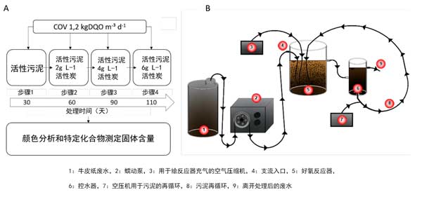 圖1:(A)實驗方法流程圖,(B)用粉狀活性炭活化的污泥系統。
