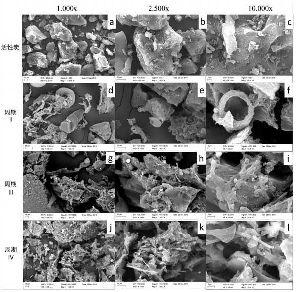 觀察圖3所示的圖像,處理期間生物量顯著增加,其中存在大量生物材料,可能的絲狀形成和微生物團聚,表明存在較大量步驟IV中的生物量。至于生物膜的發展,觀察顯微照片增加了10,000倍(圖3C,3I和3L),注意到附著在活性炭表面的微生物的生長。這些可能是細菌,真菌和絲狀細菌,活性炭在反應器運行110天后,固體樣品中的細菌含量更高。