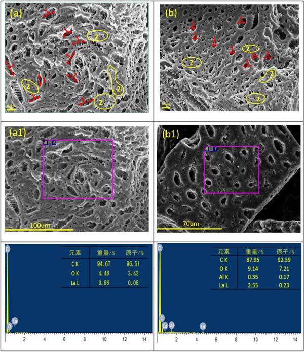 通過掃描電子顯微鏡(SEM)來顯示樣品的微觀形態和相應的能量色散光譜(EDS)圖像,以證明鑭或鋁在兩種金屬上的成功加載的活性炭,在合適條件下制備。鑭改性活性炭和鑭鋁改性活性炭的SEM圖像如圖2所示。在圖2a中,有許多橢圓形孔標記為1。鑭改性活性炭的表面較粗糙,而較細的多孔結構則標記為2。但是,鑭鋁改性活性炭的孔結構在圖3b中進行了更改。標記為1的孔結構變得更規則圓,標記為2的細孔尺寸變大,并且孔分布更均勻,這適合更好的吸附能力。從圖2a1,a2和b1,b2中的樣品中檢測到元素鑭和鋁的存在。鑭的重量百分比為0.86%,經過鑭(NO3)3·2H2O和率(NO3)3的改性后,明顯增加至2.55%。更多鑭的含量將顯示出更好的吸附性能,這可能是由于兩種元素在改性過程中的協同作用所致。