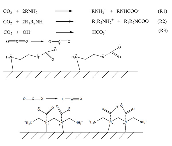 活性炭表面上存在的官能團(即胺和羥基)在二氧化碳吸附反應中起重要作用。在三亞乙基四胺中,乙二胺的伯胺(RNH2)與二氧化碳反應形成氨基甲酸酯離子,如反應(R1)和圖2所示。在MCTETA中,伯胺和仲胺(分別為RNH2和R2NH)與如反應(R2)所示,如圖2下部分所示。另一方面,活性炭中的羥基官能團可通過反應(R3)與CO2反應形成碳酸氫根離子。這解釋了為什么在改性之前,介孔炭和活性炭都已經具有二氧化碳的吸附能力。