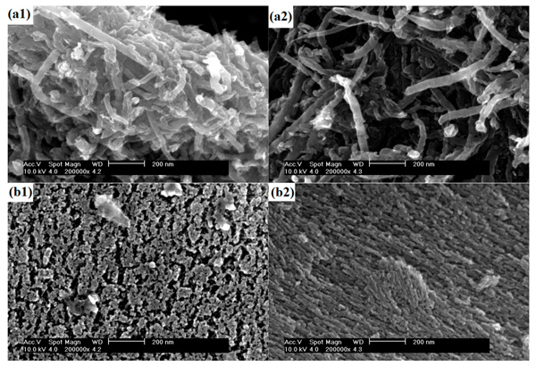 圖1:(a1):活性炭納米管載鈷,(a2):活性炭納米管,(b1):活性炭載鈷催化劑,(b2):活性炭。