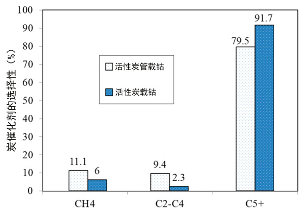 費托合成試驗是在210℃和2.5MPa的內徑為12mm的不銹鋼固定床管式反應器中進行的。將0.5g催化劑與5.0g碳化硅稀釋劑的反應混合物裝入反應器中。催化劑在425℃下在N2中的33vol%H2中原位還原10小時。還原后,將反應器冷卻至180℃,并將H2/N2氣體混合物切換為合成氣(H2:CO為2∶1)。在合成氣加壓至2.5MPa然后在4小時內重新加熱到210°C來完成反應。活性炭載鈷催化劑,活性炭納米管載鈷催化劑的CO轉化率分別為13.1%,6.7%。產物選擇性的結果在圖2中給出。與活性炭管樣品相比,活性炭產生更高的C5+和更低的CH4選擇性,這對氣體產物(C1-C4)也產生最高的選擇性。