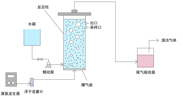 臭氧的反應裝置如圖1所示。它主要由高硼硅酸鹽玻璃和臭氧發生器制成。反應器高度為500mm,外徑和內徑分別為70和65mm,有效容積為1.5L。反應器中臭氧氣體的流量可控制在100mL分鐘以內。反應器中的氣體分配器是鈦板,其孔隙率約為20%至30%,微孔的平均孔徑約為17μm。臭氧反應尾氣的吸收溶液為濃度為1.5mol/L。對色度為600的模擬水楊酸異羥肟酸廢水500mL進行采樣,并將其放入燒杯中。將制得的活性炭量0.03、0.06、0.09、0.12、0.15和0.18g/L樣品分別添加到前一溶液中,然后用磁力攪拌器混合以達到吸附平衡,分析處理后的上清液的色度以評價處理效果。